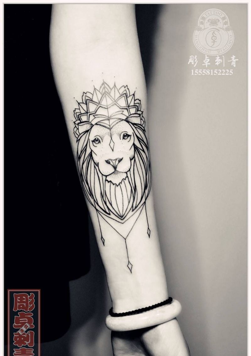 线条狮子纹身图片_成品手臂欧美动物狮子杭州纹身图案