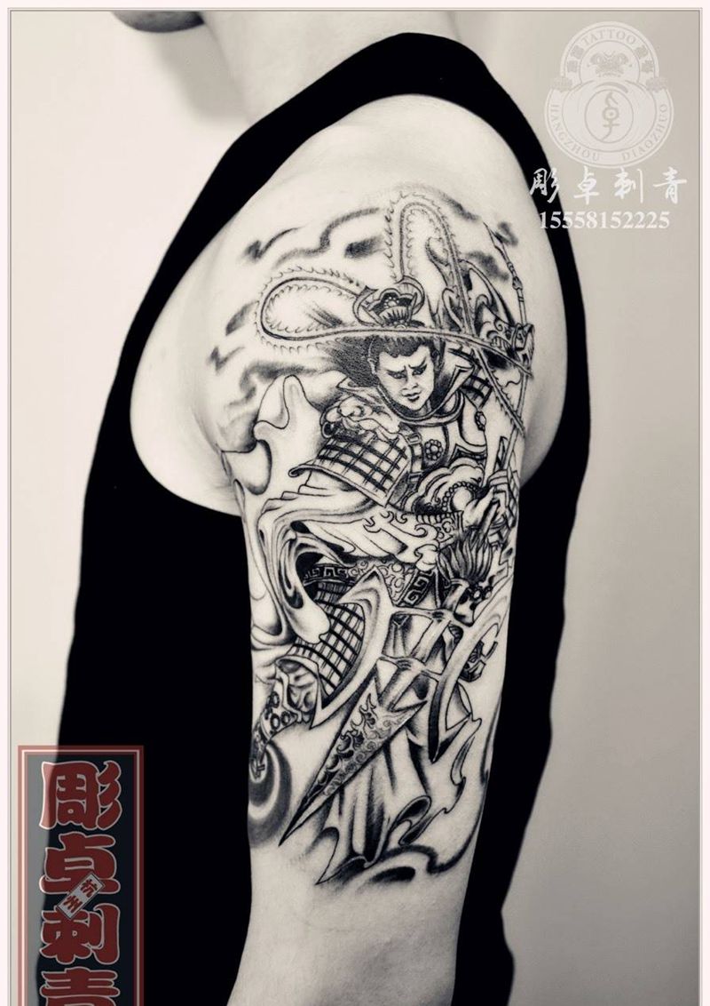 大臂吕布纹身图片_成品手臂传统人物杭州吕布纹身图案