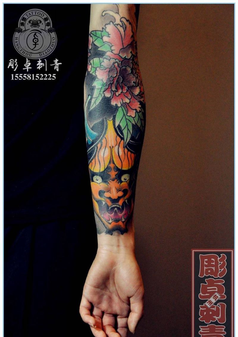改造般若花臂纹身图片_成品手臂传统鬼神人物花臂般若牡丹艺妓杭州纹身图案