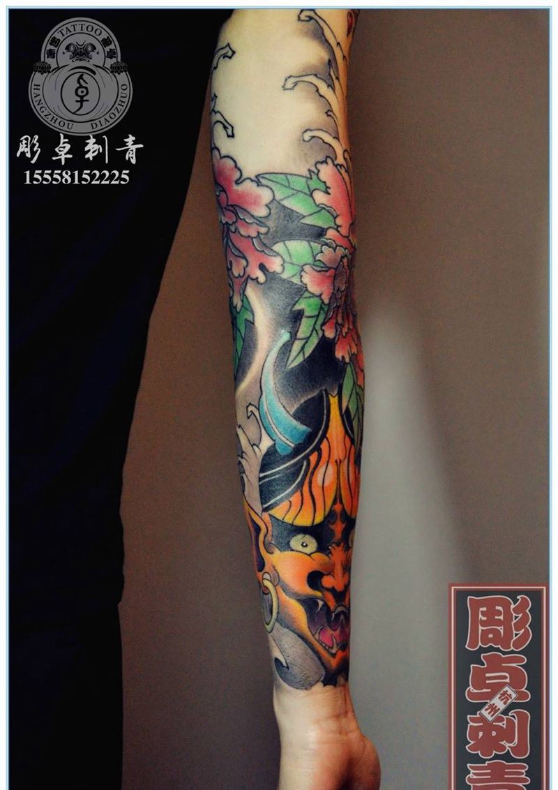 改造般若花臂纹身图片_成品手臂传统鬼神人物花臂般若牡丹艺妓杭州纹身图案