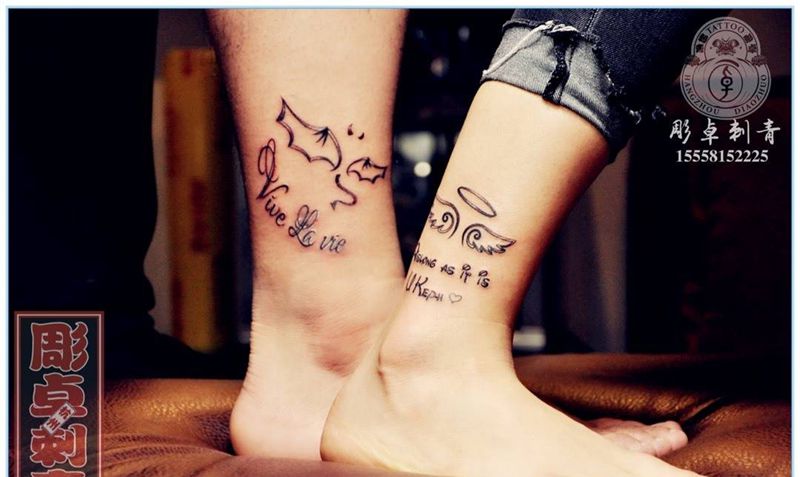 恶魔天使小情侣情侣纹身纹身图片_成品脚部清新情侣英文恶魔翅膀天使翅膀情侣杭州纹身图案