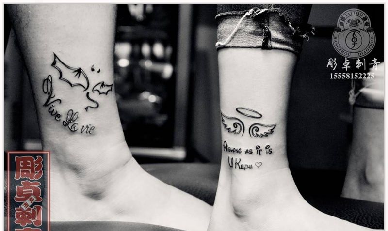恶魔天使小情侣情侣纹身纹身图片_成品脚部清新情侣英文恶魔翅膀天使翅膀情侣杭州纹身图案