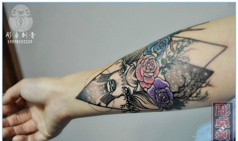 几何点刺小臂鹿纹身图片_成品手臂欧美动物鹿杭州纹身图案