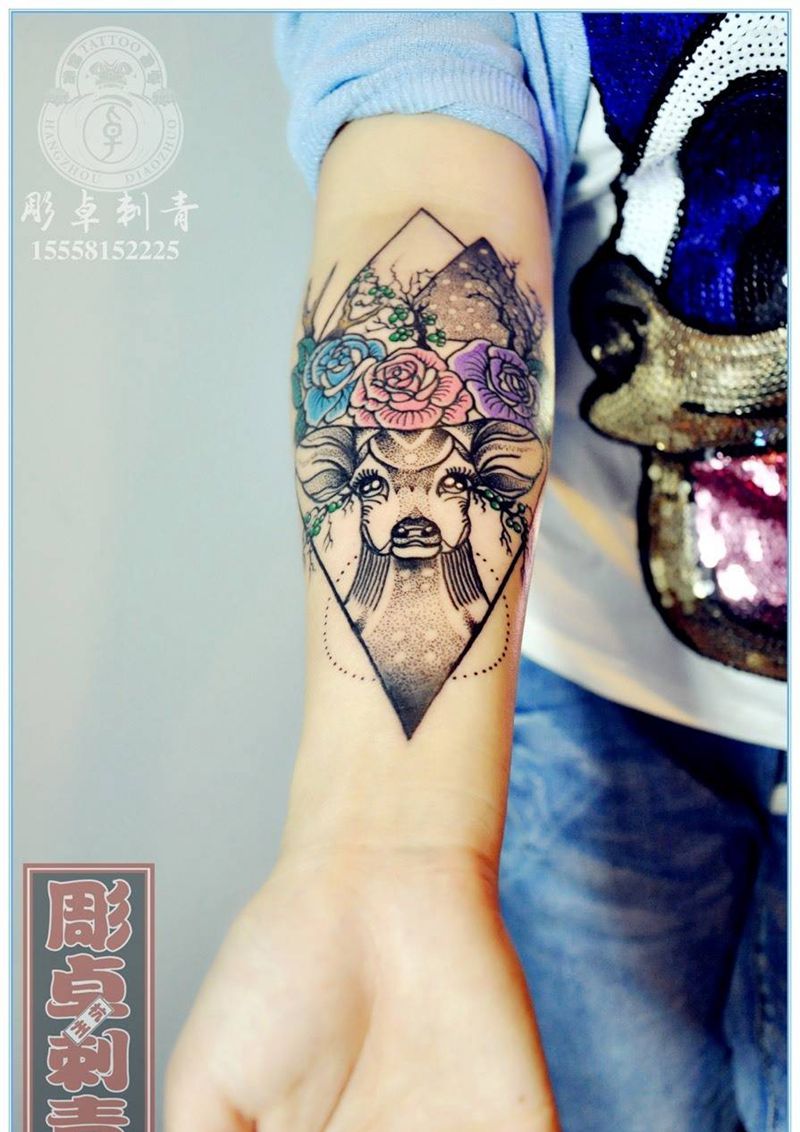 几何点刺小臂鹿纹身图片_成品手臂欧美动物鹿杭州纹身图案