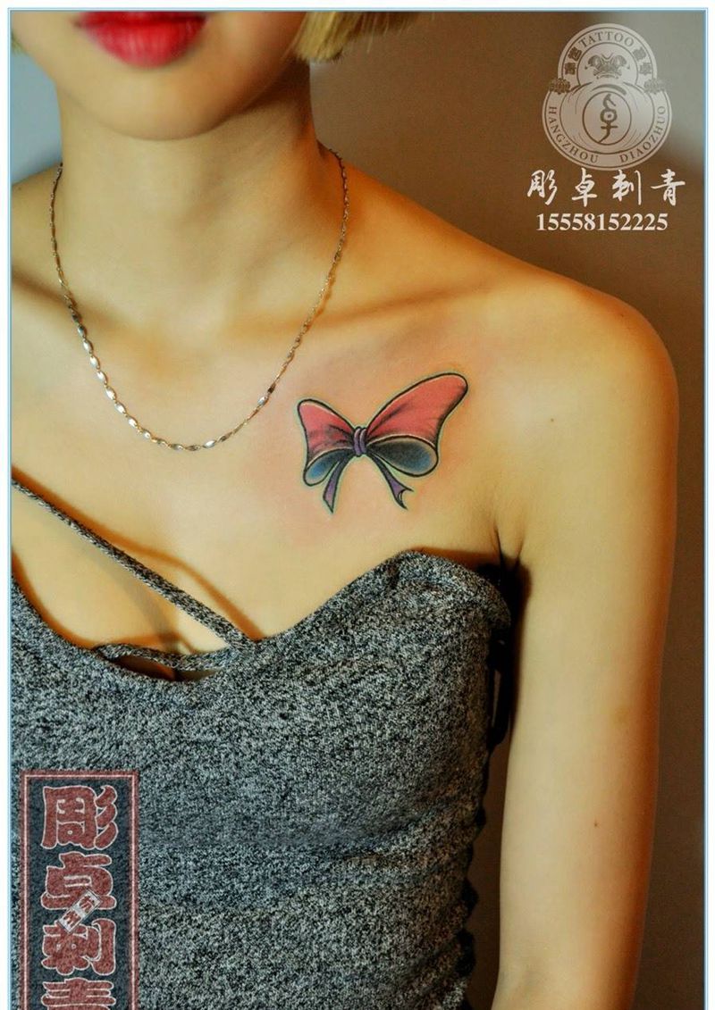 锁骨蝴蝶结遮盖纹身图片_成品颈部肩部清新欧美蝴蝶结杭州锁骨遮盖纹身图案