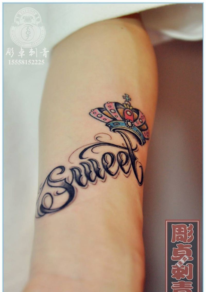 花体英文皇冠纹身图片_成品手臂欧美字符Schoo 花体英文皇冠杭州纹身图案