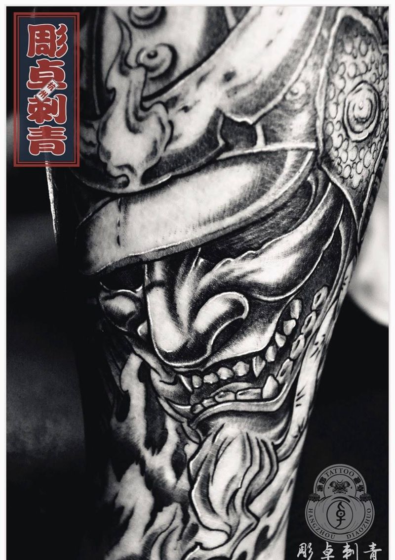 小腿鬼武士纹身图片_成品腿部传统鬼神杭州鬼武士日本武士纹身图案
