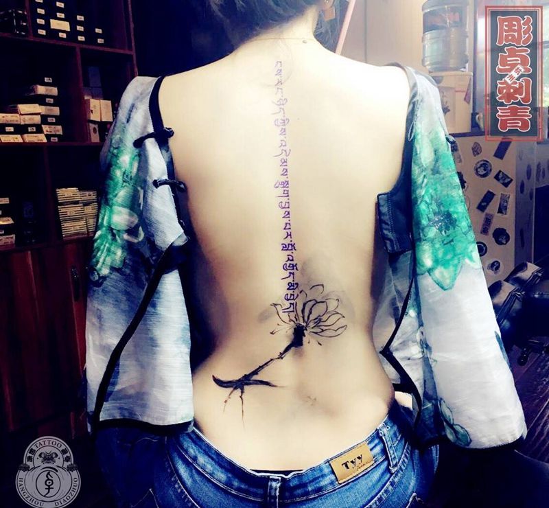 脊椎脊柱梵文莲花纹身图片_成品背部传统清新原创植物字符杭州莲花梵文藏文纹身图案