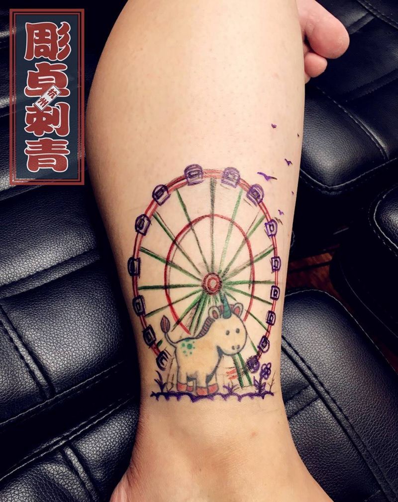 摩天轮纹身图片_成品脚部清新欧美修改遮盖摩天轮独角兽纹身图案