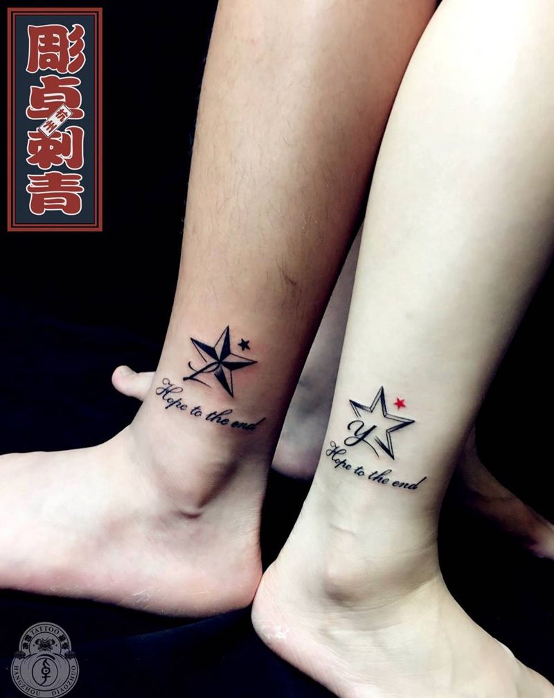 当前位置: 首页 >浙江省杭州市纹身店-雕卓刺青纹身图案>情侣纹身纹身图片_成品腿部脚部清新情侣原创英文五角星纹身图案