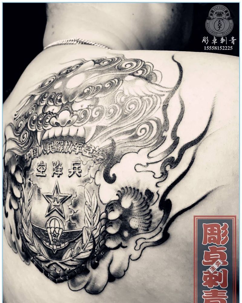 军旅记忆纹身图片_成品肩部背部写实传统欧美原创唐狮军牌纹身图案
