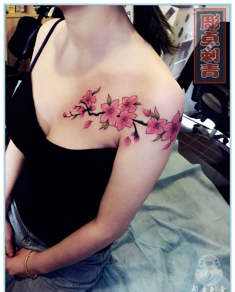修改桃花纹身图片_成品胸部传统清新植物锁骨纹身图案