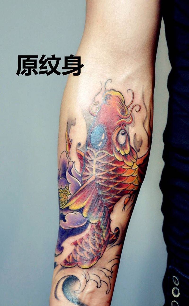 不动花臂纹身图片_成品手臂传统宗教花臂鲤鱼不动明王纹身图案