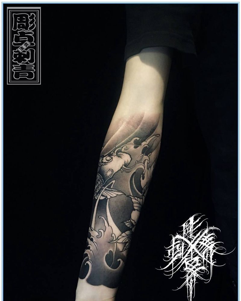当前位置: 首页 >浙江省杭州市纹身店-雕卓刺青纹身图案>鲤鱼牡丹包小臂纹身图片_成品手臂传统动物包小臂鲤鱼牡丹纹身图案