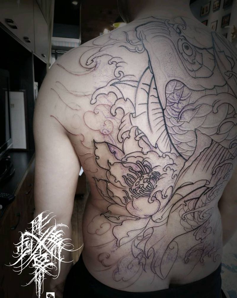 满背鲤鱼未完纹身图片_背部新传统老传统满背鲤鱼纹身图案