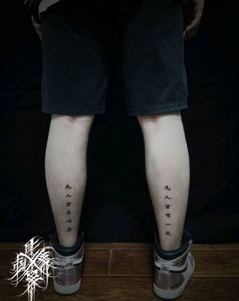 当前位置: 首页 >浙江省杭州市纹身店-雕卓刺青纹身图案>字纹身图片_腿部水墨毛笔字书法纹身图案