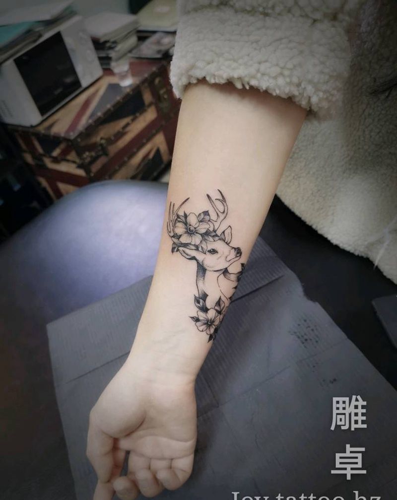 当前位置: 首页 >浙江省杭州市纹身店-雕卓刺青纹身图案>麋鹿遮盖纹身图片_手臂New School鹿纹身图案
