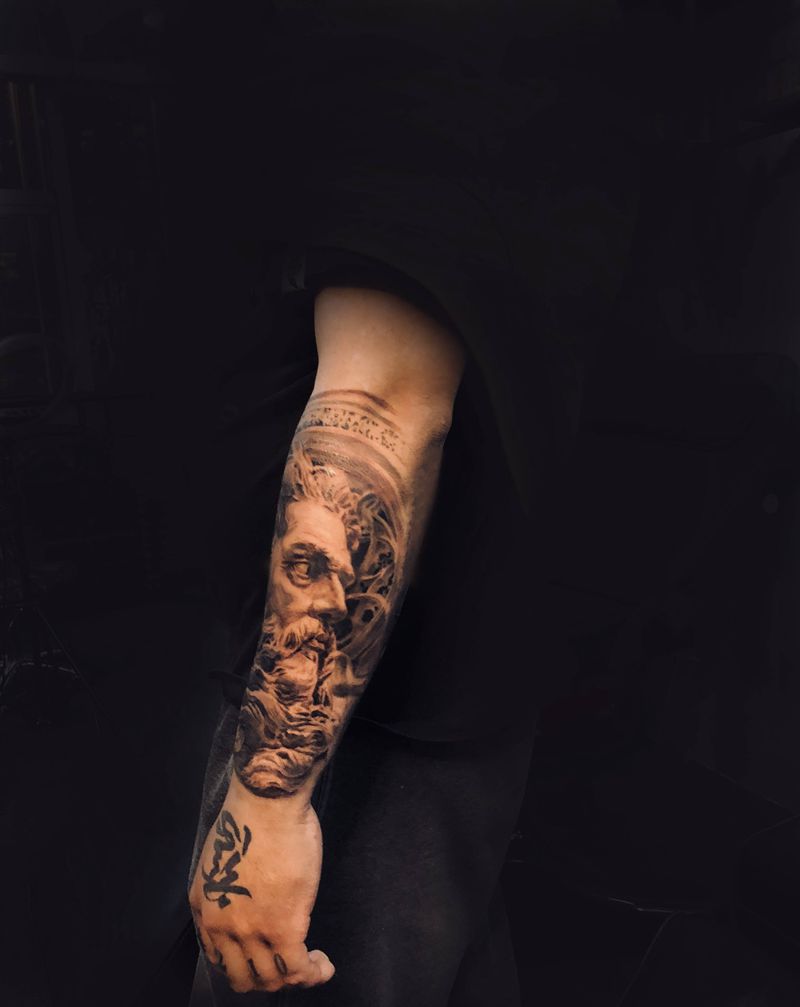 当前位置: 首页 >浙江省杭州市纹身店-刺刻工廠纹身图案>海神波塞冬纹身图片_手臂欧美写实纹身图案