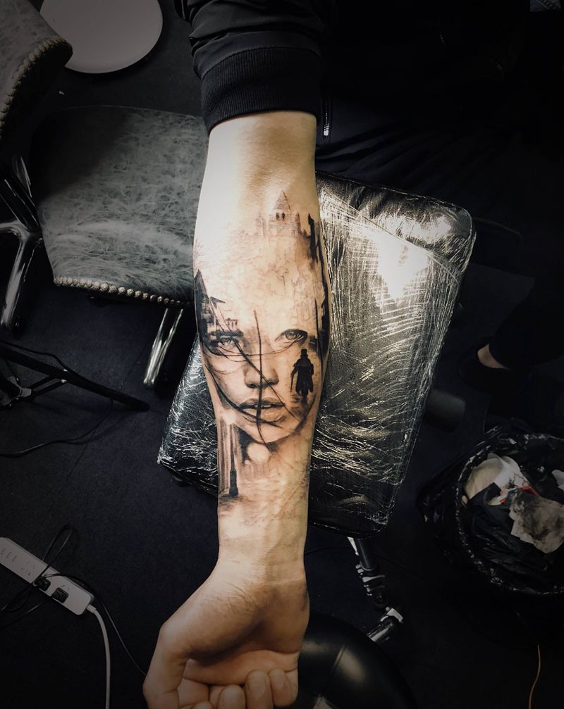 城市记忆纹身图片_手臂欧美写实纹身图案