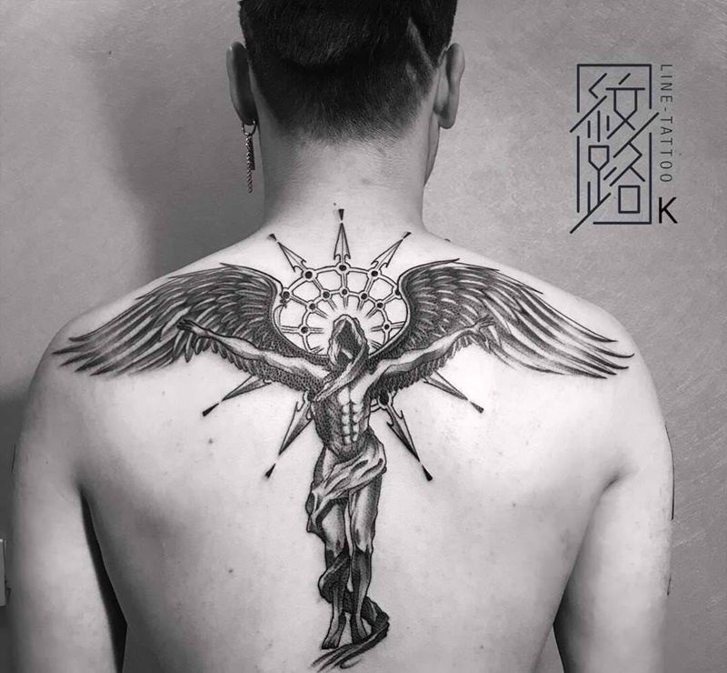 守护天使纹身图片_背部欧美黑灰纹身图案