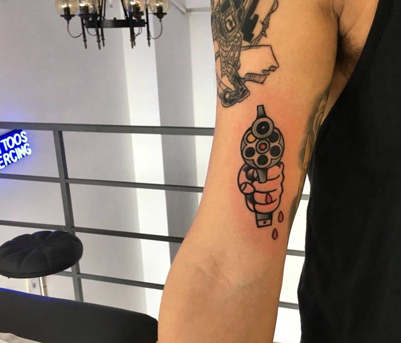当前位置: 首页 >浙江省杭州市纹身店-蜉蝣刺青工作室纹身图案>手枪纹身图片_成品手臂欧美静物school纹身图案