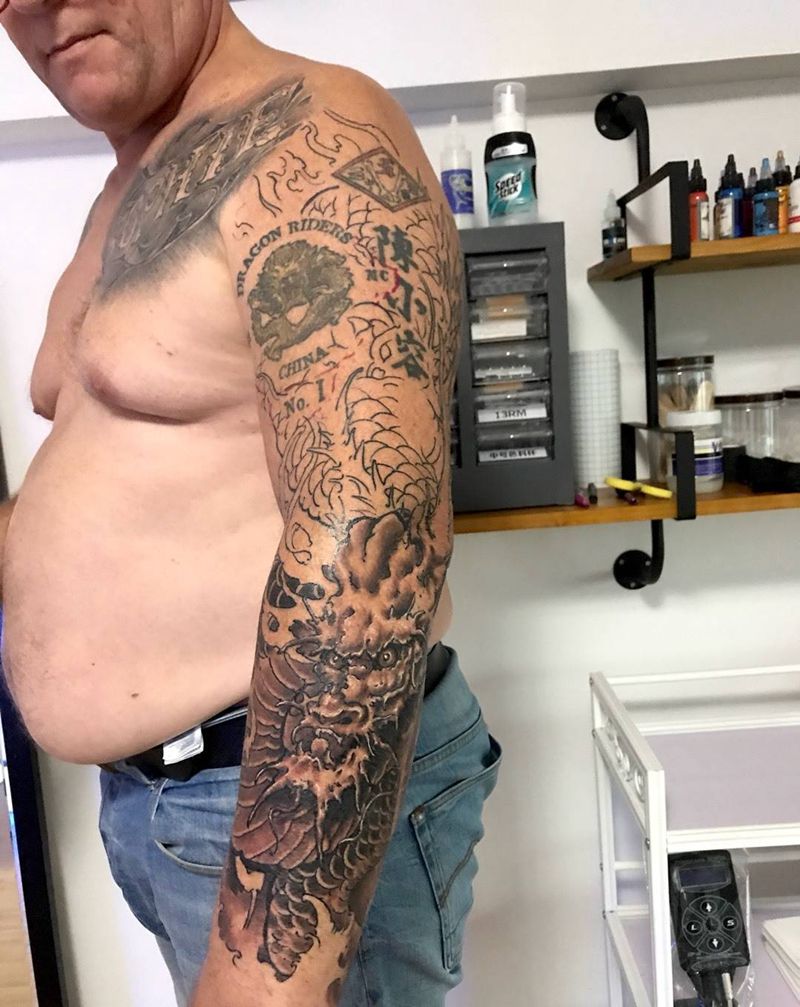 当前位置: 首页 >浙江省杭州市纹身店-蜉蝣刺青工作室纹身图案>龙花臂纹身图片_成品手臂传统动物宗教纹身图案