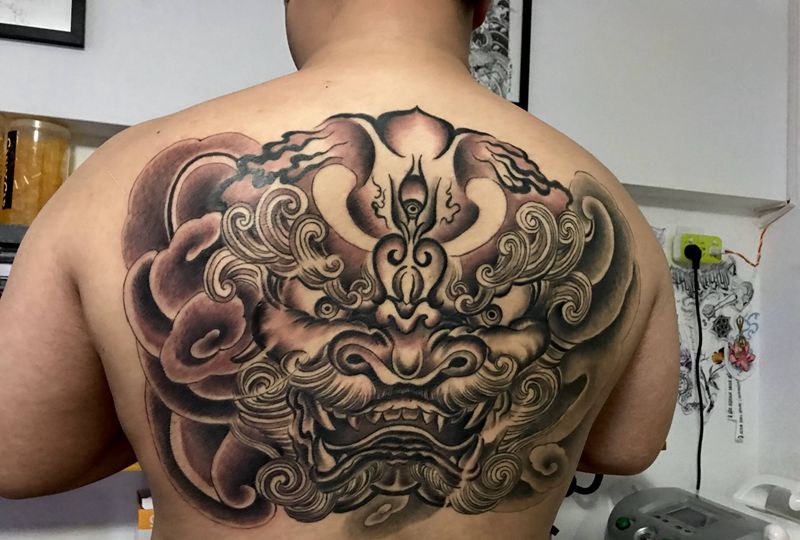 当前位置: 首页 >浙江省杭州市纹身店-蜉蝣刺青工作室纹身图案>唐狮纹身图片_成品腰部背部传统动物鬼神宗教习俗纹身图案