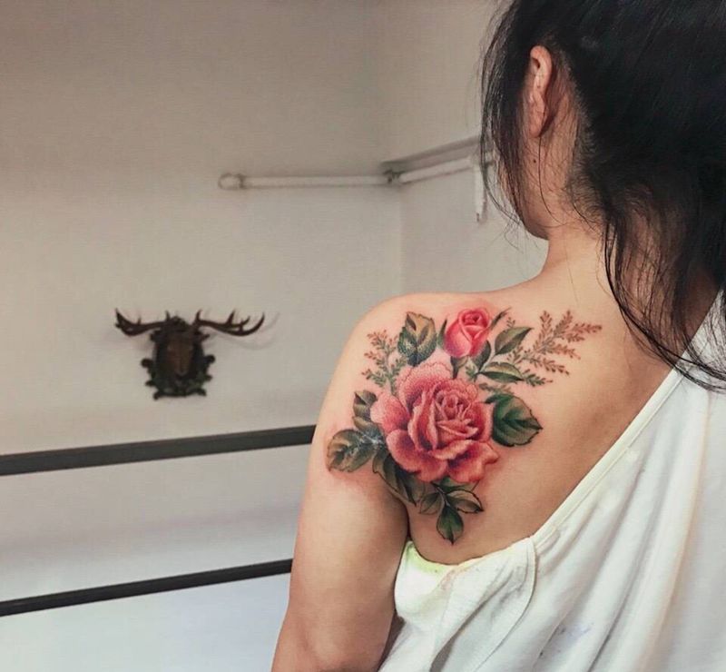 玫瑰遮盖图纹身图片_成品背部欧美写实静物原创纹身图案