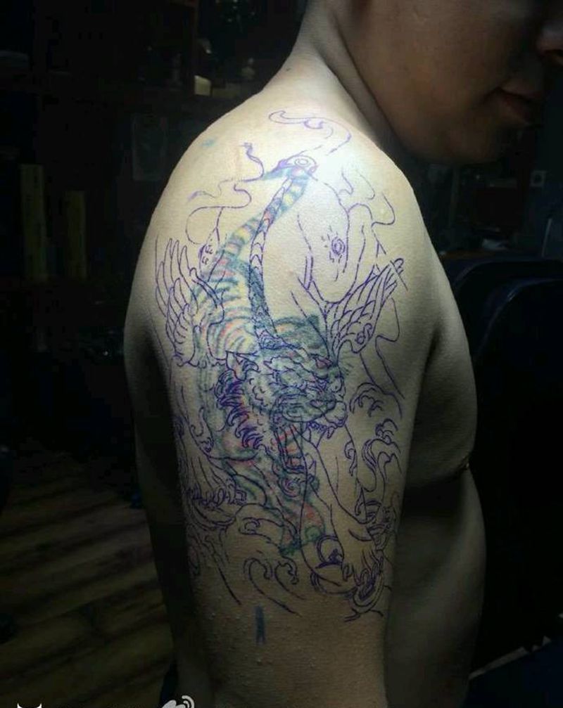 • T网红王老大花腿龙纹身图片_腿部新传统纹身图案