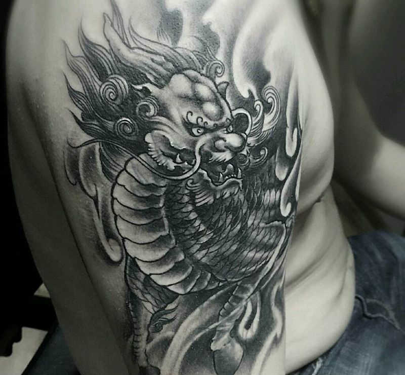 • T网红王老大花腿龙纹身图片_腿部新传统纹身图案