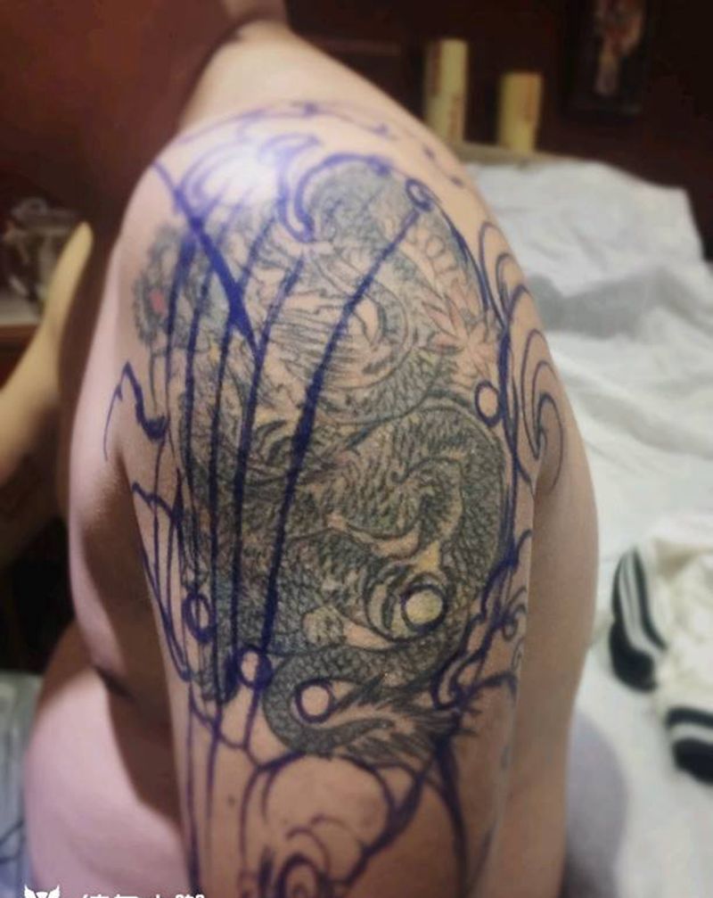 • T网红王老大花腿龙纹身图片_腿部新传统纹身图案