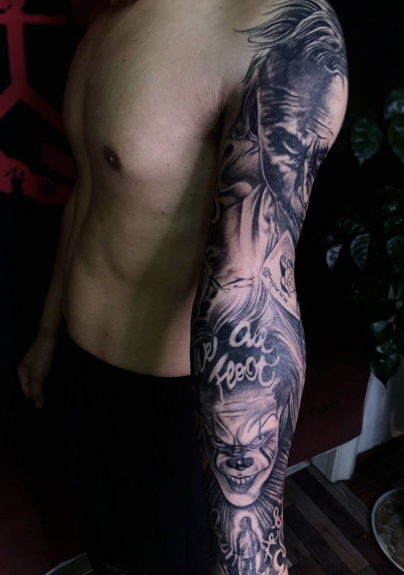 当前位置: 首页 >浙江省杭州市纹身店-纹人天下刺青会所纹身图案>小丑纹身图片_手臂肩部欧美写实纹身图案