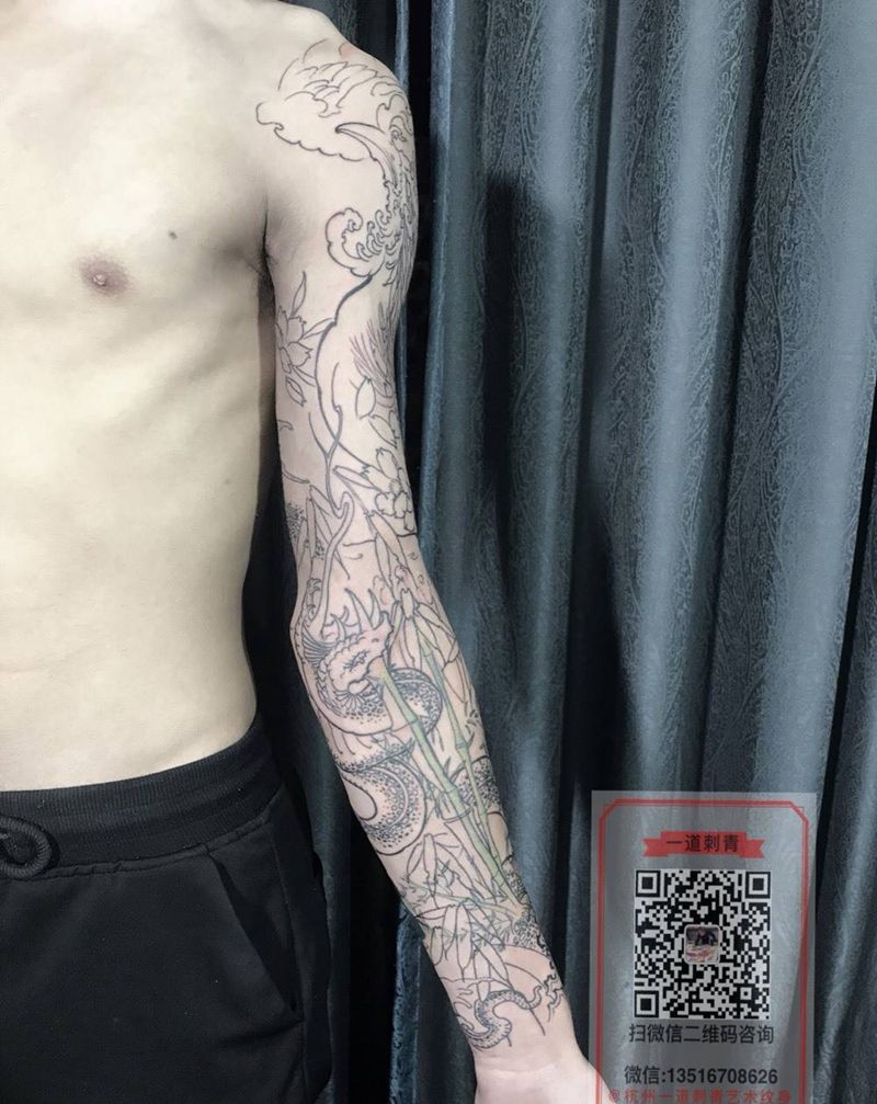 当前位置: 首页 >浙江省杭州市纹身店-今刺古青纹身图案>凤凰花臂遮盖,线条!纹身图片_传统动物手臂纹身图案