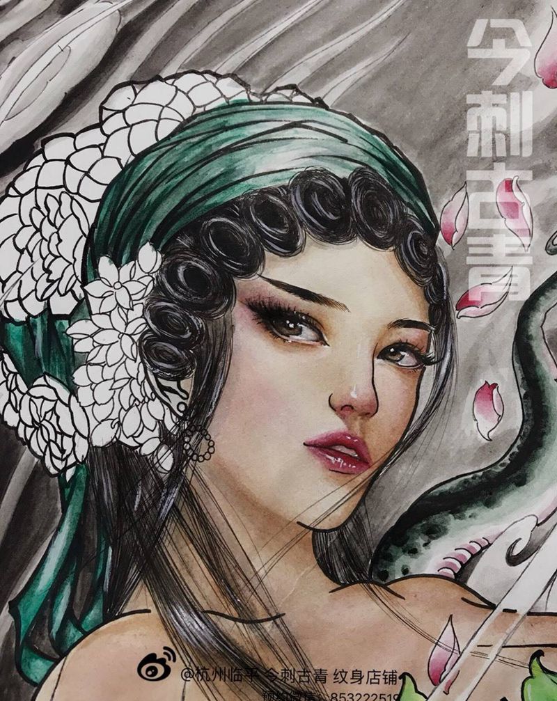 当前位置: 首页 >浙江省杭州市纹身店-今刺古青纹身图案>青蛇纹身图片_手稿原创人物传统手臂插画美女艺妓纹身图案