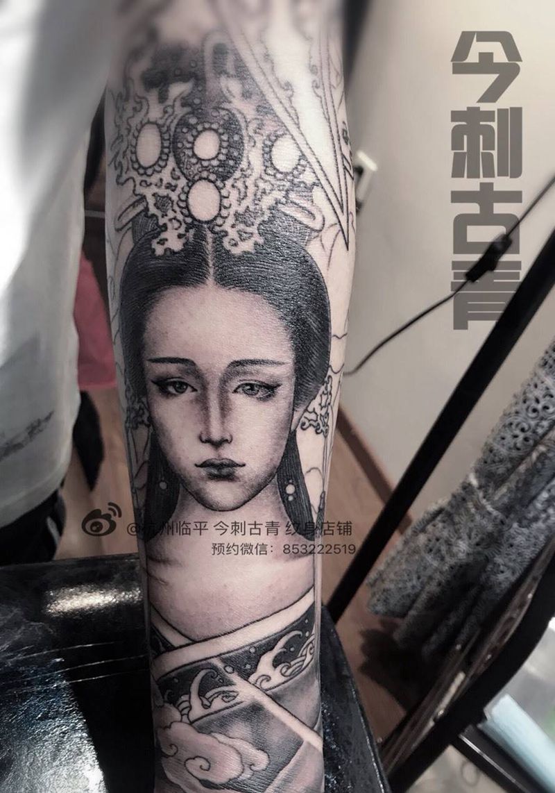 当前位置: 首页 >浙江省杭州市纹身店-今刺古青纹身图案>《貂蝉》纹身图片_人物写实传统肖像原创花臂女神美女艺妓手臂纹身图案