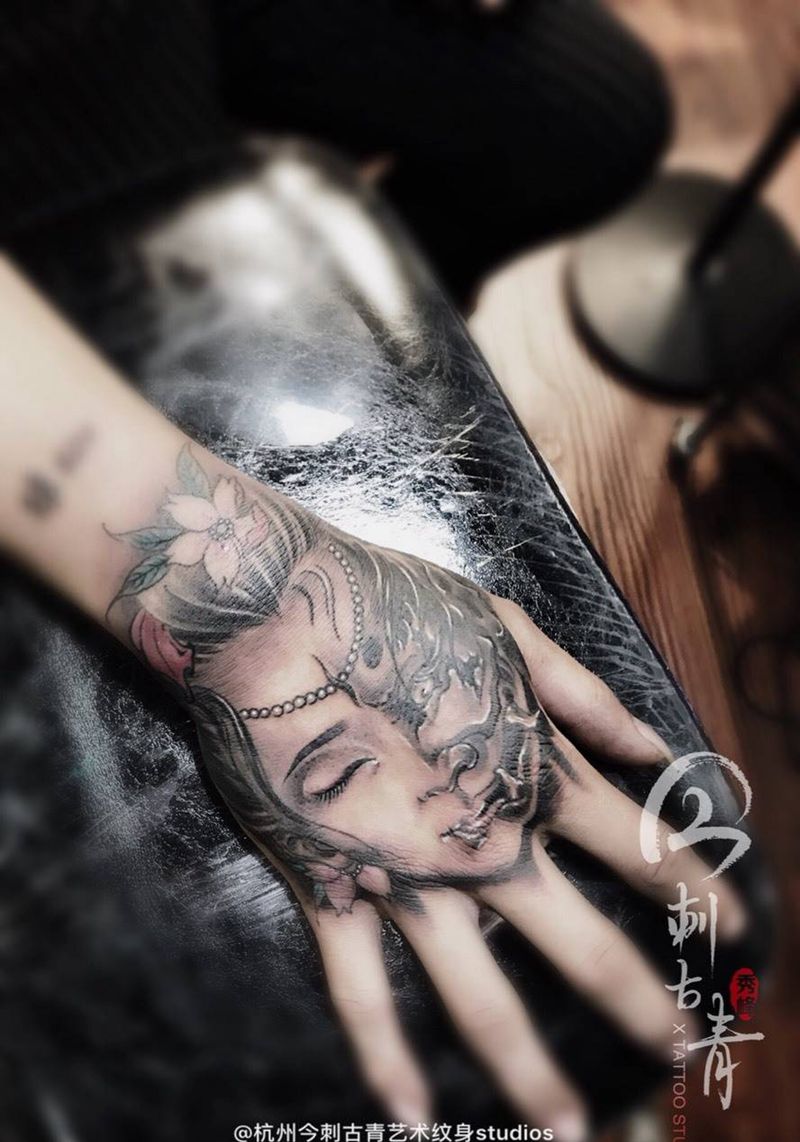 当前位置: 首页 >浙江省杭州市纹身店-今刺古青纹身图案>遮盖纹身图片_手部原创美女艺妓纹身图案