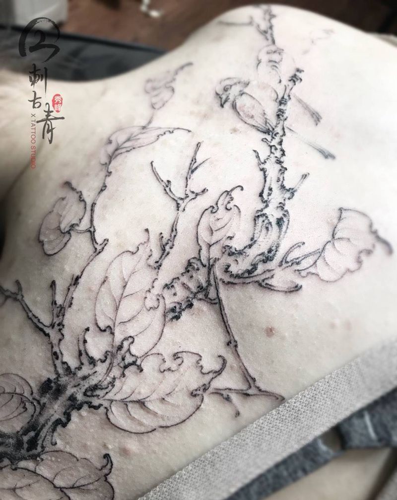 当前位置: 首页 >浙江省杭州市纹身店-今刺古青纹身图案>作画一幅纹身图片_原创传统动物背部花臂女神国画纹身图案