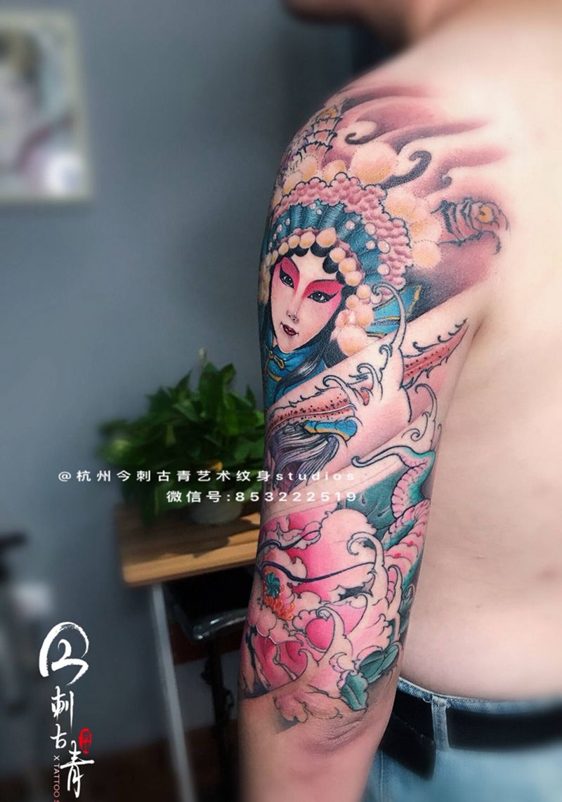 当前位置: 首页 >浙江省杭州市纹身店-今刺古青纹身图案>《花旦》纹身图片_手臂新传统花旦艺妓原创纹身图案