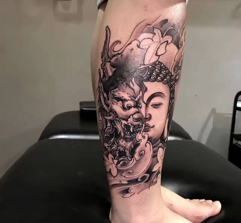 半佛半魔一念之间纹身作品纹身图片_手稿成品脚部腿部传统清新国画宗教鬼神原创纹身图案