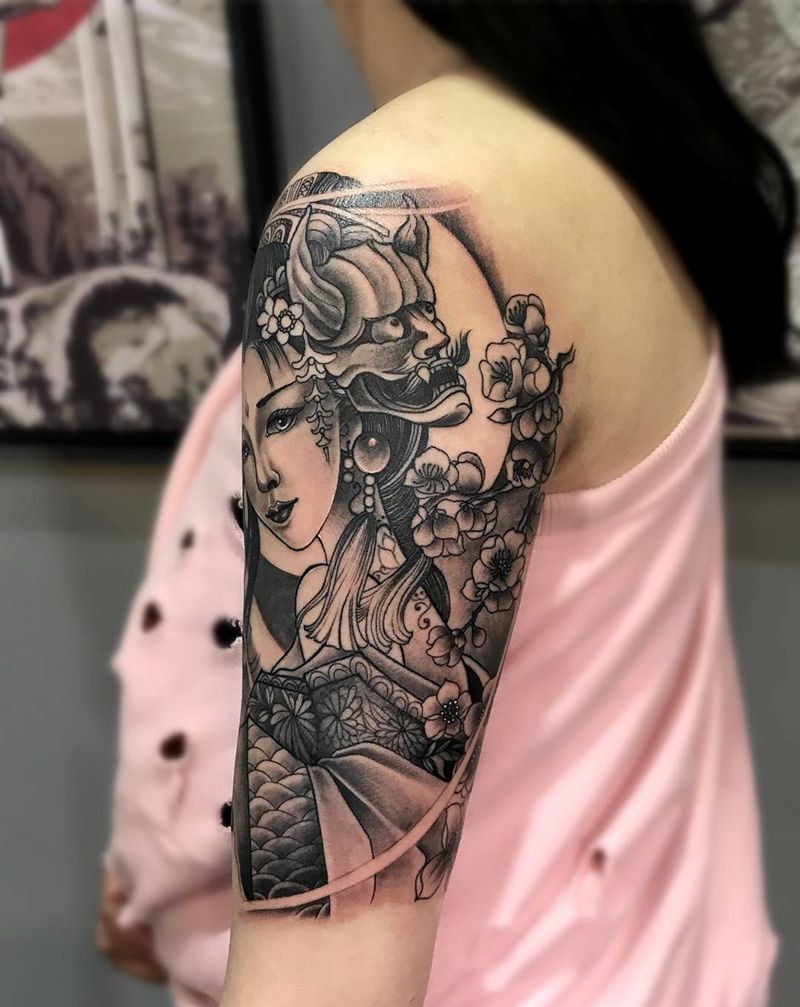 大臂艺妓纹身图片_插画成品肩部手臂传统肖像清新人物静物纹身图案