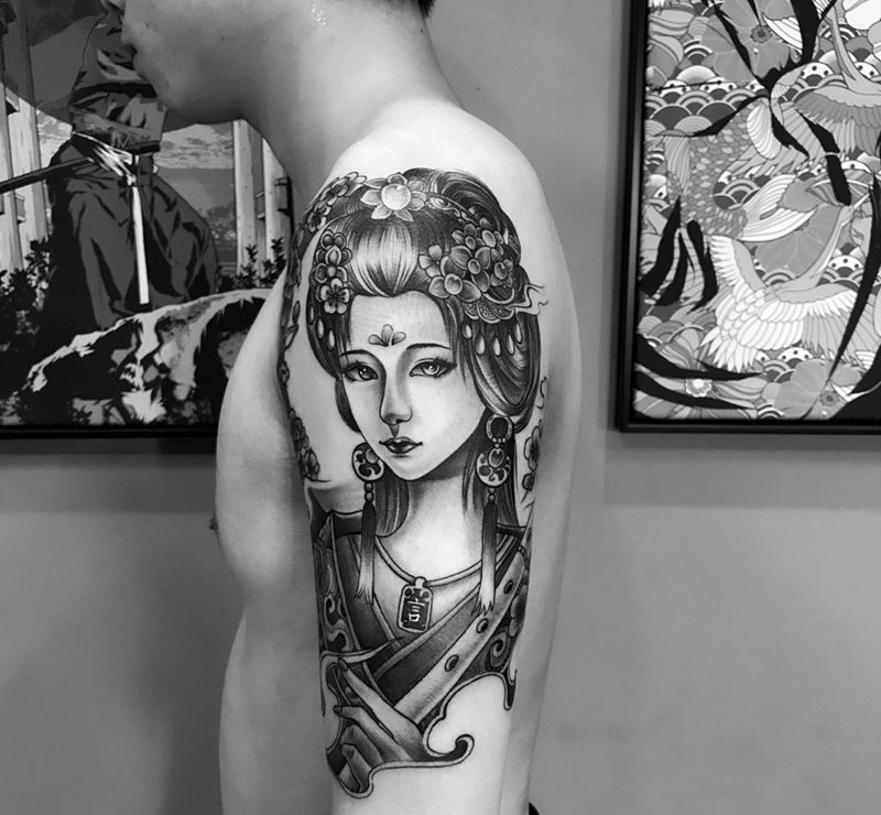 大臂明月艺姬纹身图片_成品手稿插画手臂肩部肖像习俗国画原创人物纹身图案