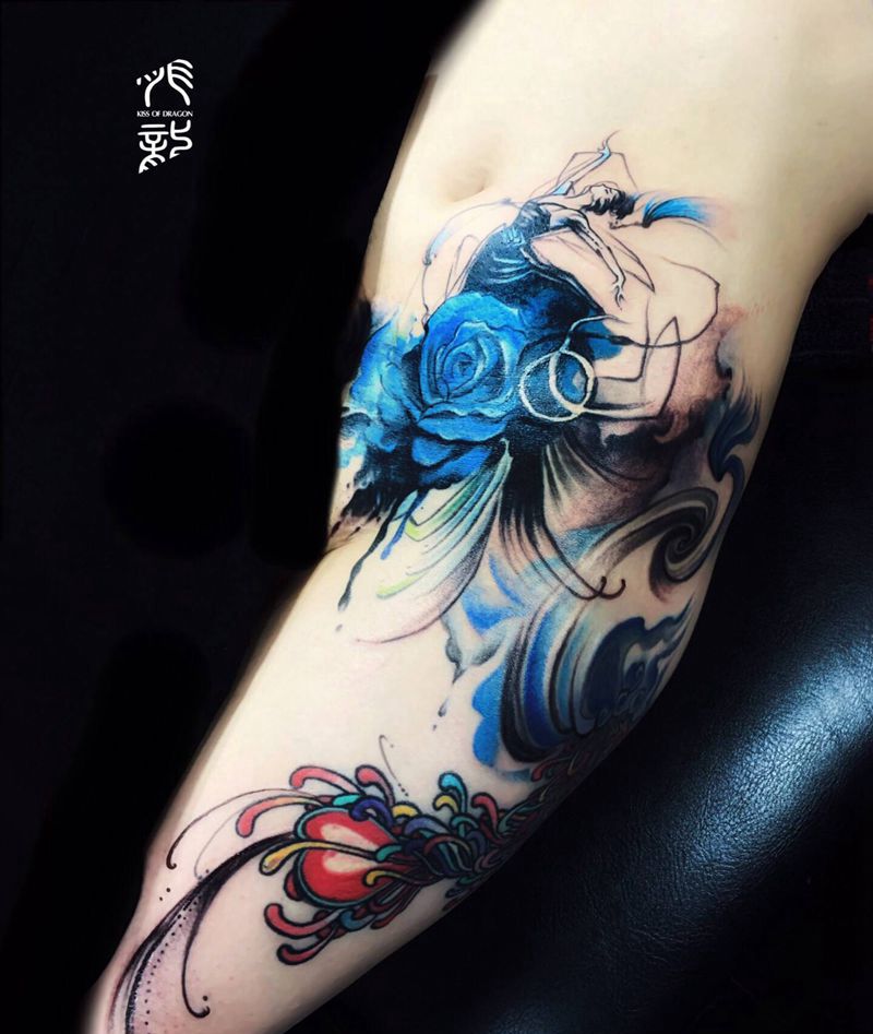 当前位置: 首页 >浙江省宁波市纹身店-龍之吻刺青纹身图案>玫瑰精灵遮盖旧纹身纹身图片_腹部腿部新传统纹身图案