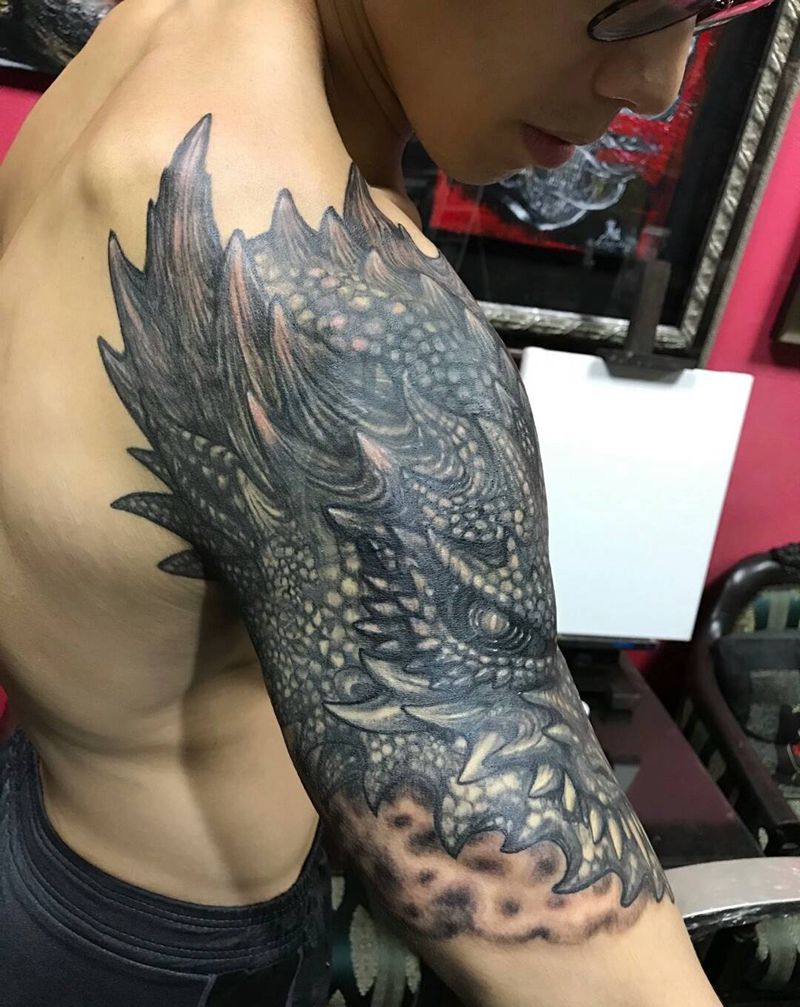 • T网红王老大花腿龙纹身图片_腿部新传统纹身图案