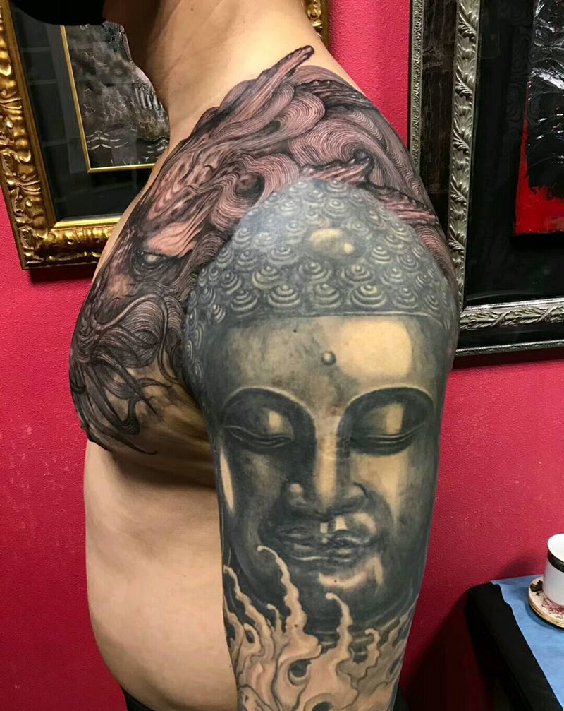 龙与佛纹身图片_肩部手臂老传统纹身图案