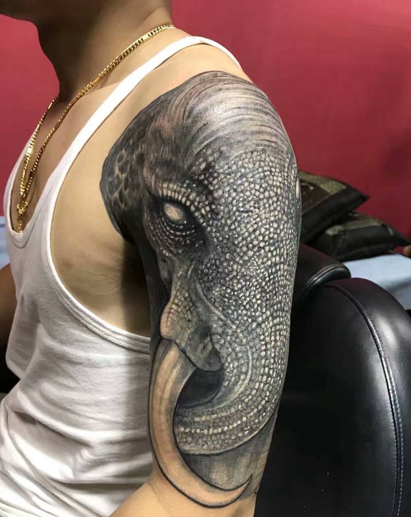 遮盖作品纹身图片_成品手臂传统写实原创遮盖象神纹身图案