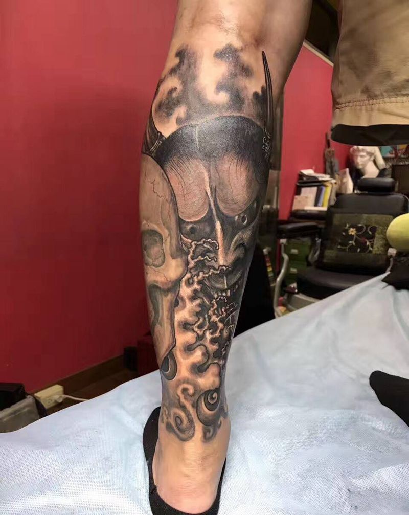 般若纹身图片_成品腿部传统写实原创鬼神纹身图案
