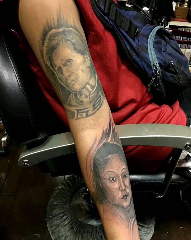 当前位置: 首页 >浙江省宁波市纹身店-惊骇空间纹身图案>肖像纹身图片_手臂肖像原创纹身图案
