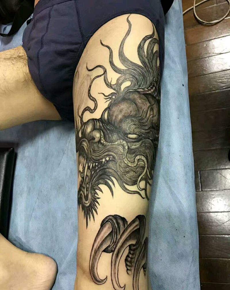 • T网红王老大花腿龙纹身图片_腿部新传统纹身图案