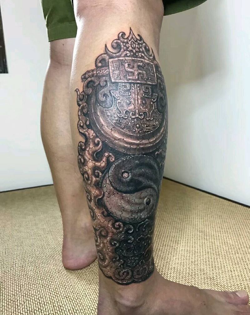 驚駭文物纹身图片_腿部原创成品纹身图案