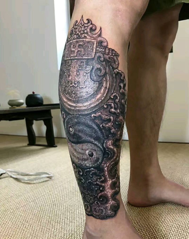 驚駭文物纹身图片_腿部原创成品纹身图案